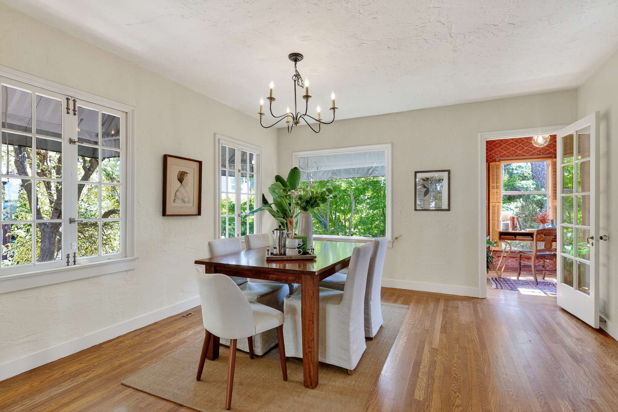 The main level features two bedrooms, including a spacious primary suite with classic French doors, along with an elegant living room and fireplace, a sunny kitchen, a formal dining room, and a charming office nook.